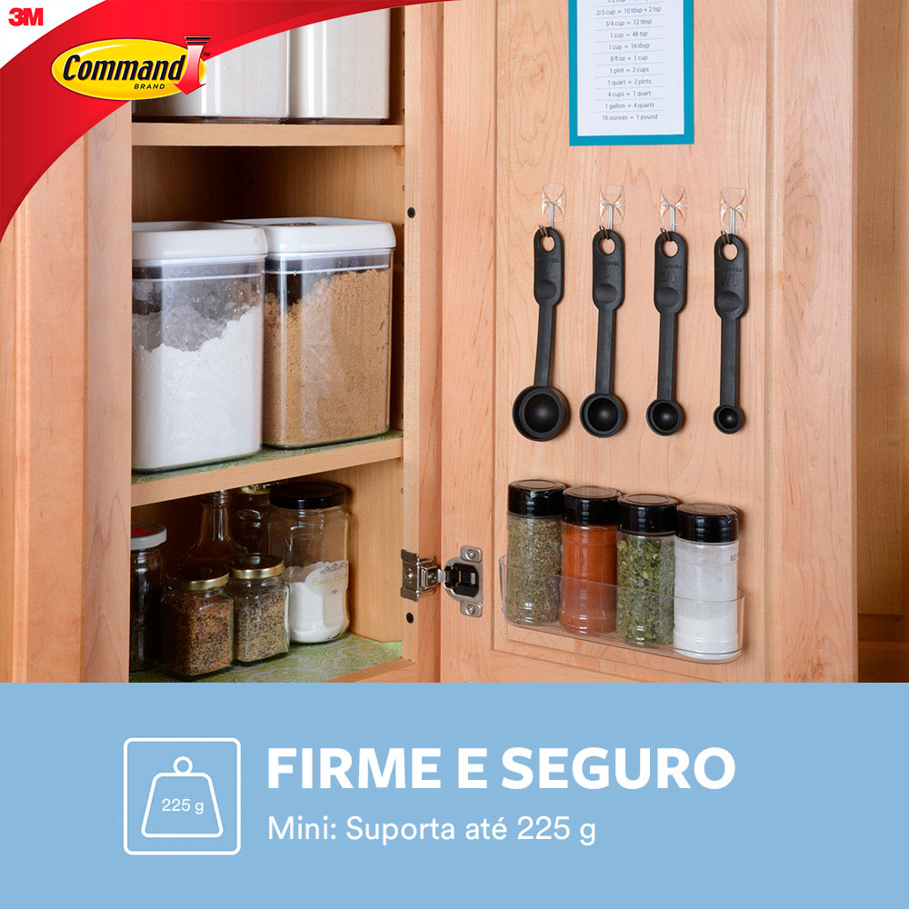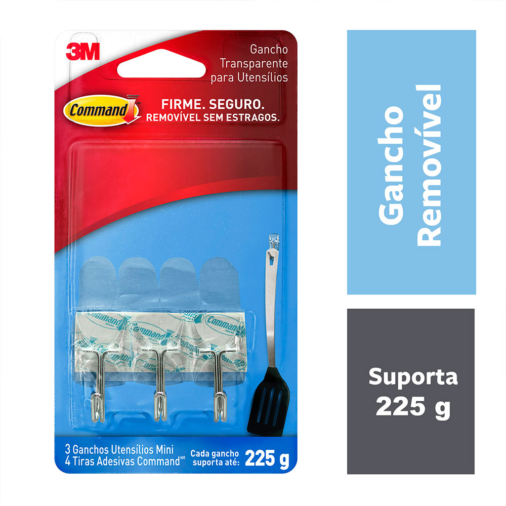 O Gancho Adesivo para Utensílios Command 3M é extremamente discreto e perfeito para ser usado sem necessidade de pregos ou parafusos. Fácil de instalar e remover, não deixa marcas ou resíduos. Produzido em poliestireno e polietileno transparente, o pacote conta com 3 ganchos e 4 adesivos, cada gancho suporta até 255g.