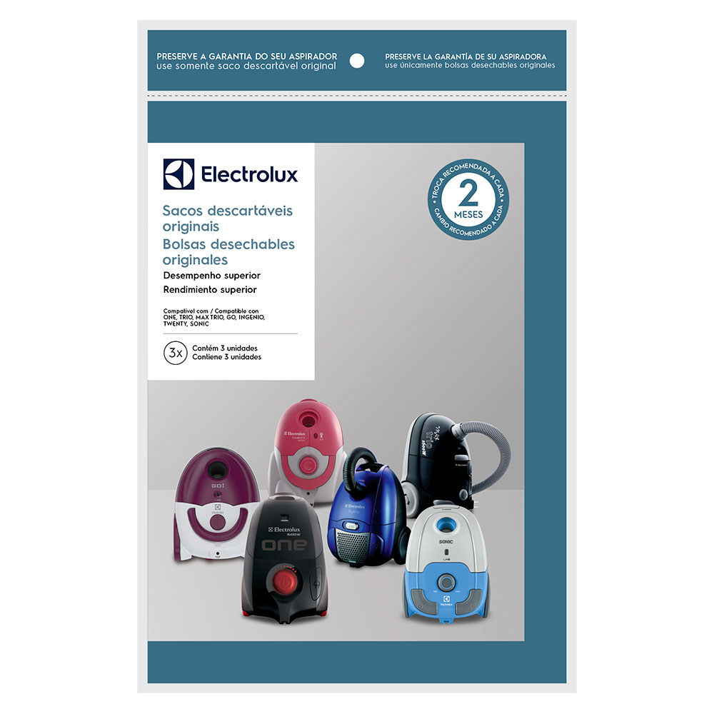 Os Sacos Descartáveis Para Aspirador de Pó Electrolux modelo SBEON são descartáveis e 100% recicláveis, sendo produzidos para aprisionar ácaros e para evitar que as partículas de poeira vazem, ficando retidas no saco sem retornar ao ambiente. São fáceis de instalar e de retirar. Garantem a durabilidade do motor e o poder de sucção com 2 níveis de filtragem. O kit vem com 3 sacos originais que são práticos, higiênicos e biodegradáveis. Compatíveis com os modelos de aspirador da Electrolux One, Trio, Max Trio, Go!, Ingenio, Twenty e Sonic.